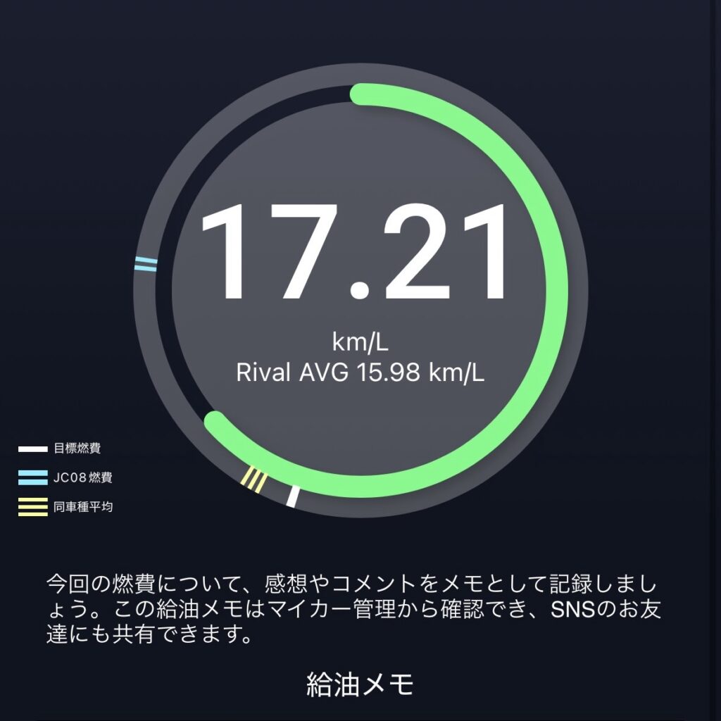 燃費は前回17.43km/Lに対して17.21km/L。
