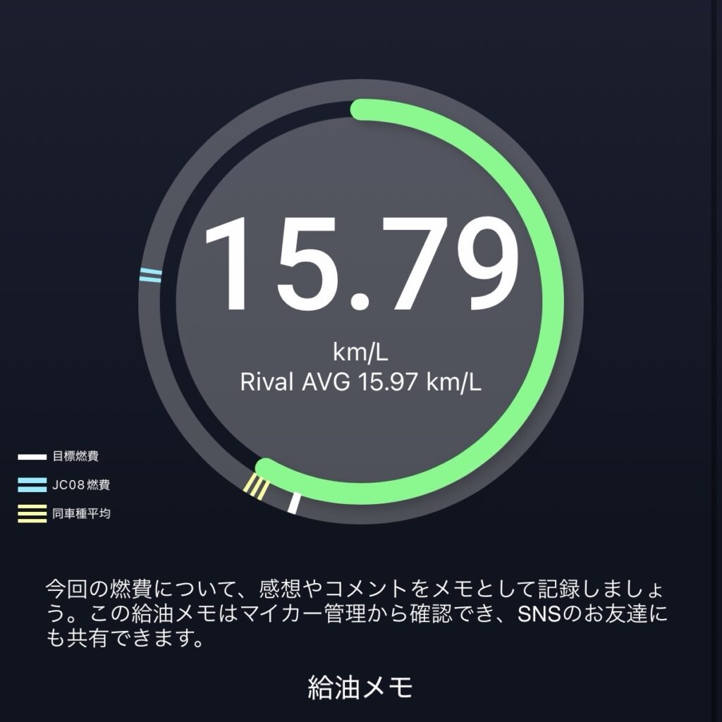 燃費は前回18.02km/Lに対して15.79km/L。